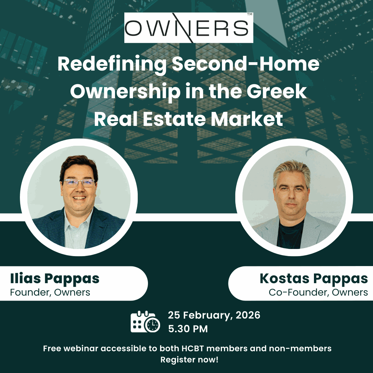 With us, to analyze and discuss the opportunities OWNERS offers to clients interested in investing in Greece we will have Ilias Pappas, Founder, OWNERS, and Kostas Pappas, Co-founder, OWNERS.